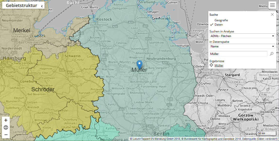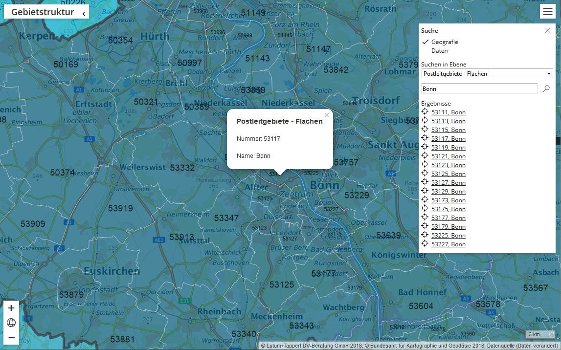 Hierzu wählen Sie zunächst die passende Ebene aus (z. B. Postleitgebiete), anschließend kann im unteren Feld ein Suchbegriff eingegeben werden (z. B. Bonn). Nachdem die Suche durch Klick auf die Lupe ausgelöst wurde, wird eine Ergebnisliste angezeigt.