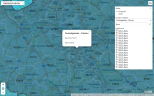 Nun kann eines der Ergebnisse ausgewählt werden und auf dem gewünschten Gebiet erscheint ein Datenfenster. Durch Klick auf das Fadenkreuz wird neben dem Erscheinen eines Datenfensters zusätzlich in das ausgewählte Gebiet gezoomt.