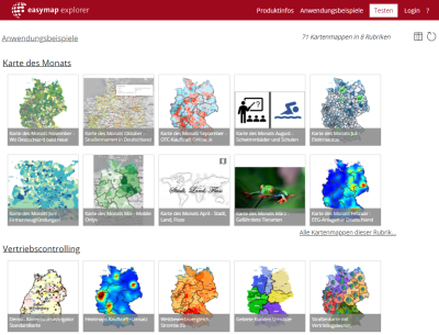 A click on the preview images directs you to the description of the workbook. Click on the Shortcut icon , skip the workbook information and go directly from the map catalog to the map view. This icon appears when you hover over the map you want to access.