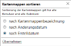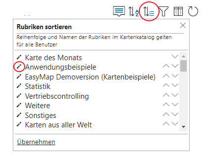 In the internal area (or for administrators) of the map catalog you can sort workbooks and categories. The set sorting applies to all users of easymap explorer.