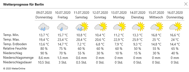 You can activate this function under the advanced settings of the workbook when sharing in easymap office. By clicking on the "Sun" in the data window in easymap explorer, a dialog opens with the weather forecast for the next 8 days. In addition, you can directly access the WeatherOnline website and take a closer look at the weather forecast. This feature originated from our customizing.