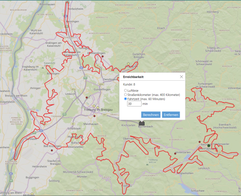 Travel time: The maximum value of the travel time is limited to 60 minutes due to technical reasons of Microsoft. The calculation for the minutes refers to the fastest route. Here, all common roads or the motorways, the federal roads and the state roads are preferably used for the calculation.