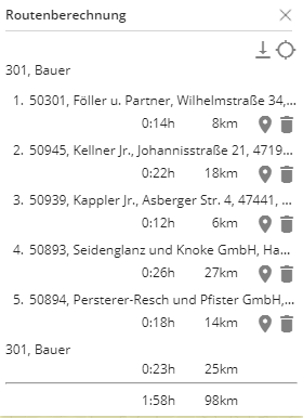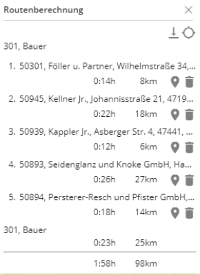 Here it is also possible to remove the individual stopovers from the route by clicking on the container and to display each individual location on the map by clicking on the "pin". With a click on the entire route is displayed on the map.