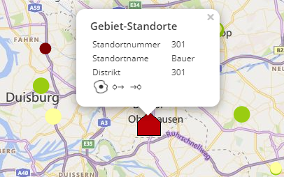 This function allows you to create and calculate a route with stopovers directly in easymap explorer. You may define different start and destination locations by clicking on the circle with the arrow in the data window. All available location-based analyses, territory locations and map layers (e.g. the areas of the 5-digit postal codes) are available as start and destination locations.
